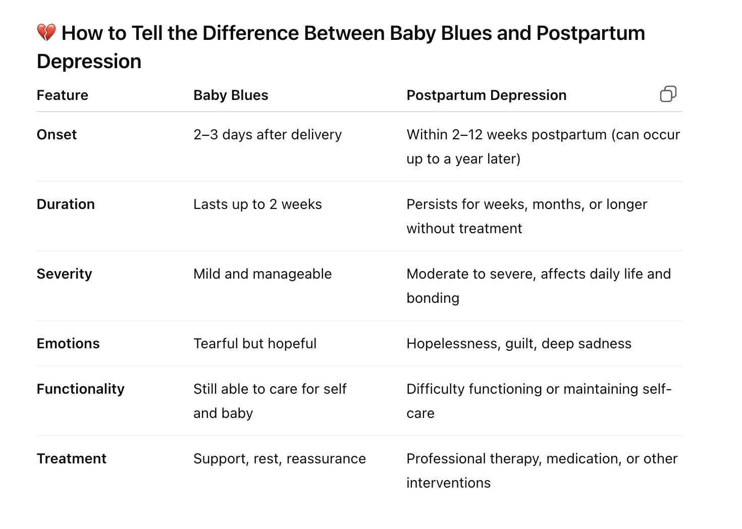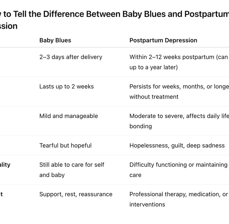 Postpartum “baby blues” and postpartum depression share some emotional overlap, but they differ in intensity, duration, and impact. Baby blues are short-lived and mild, while postpartum depression is deeper, more persistent, and requires professional treatment.